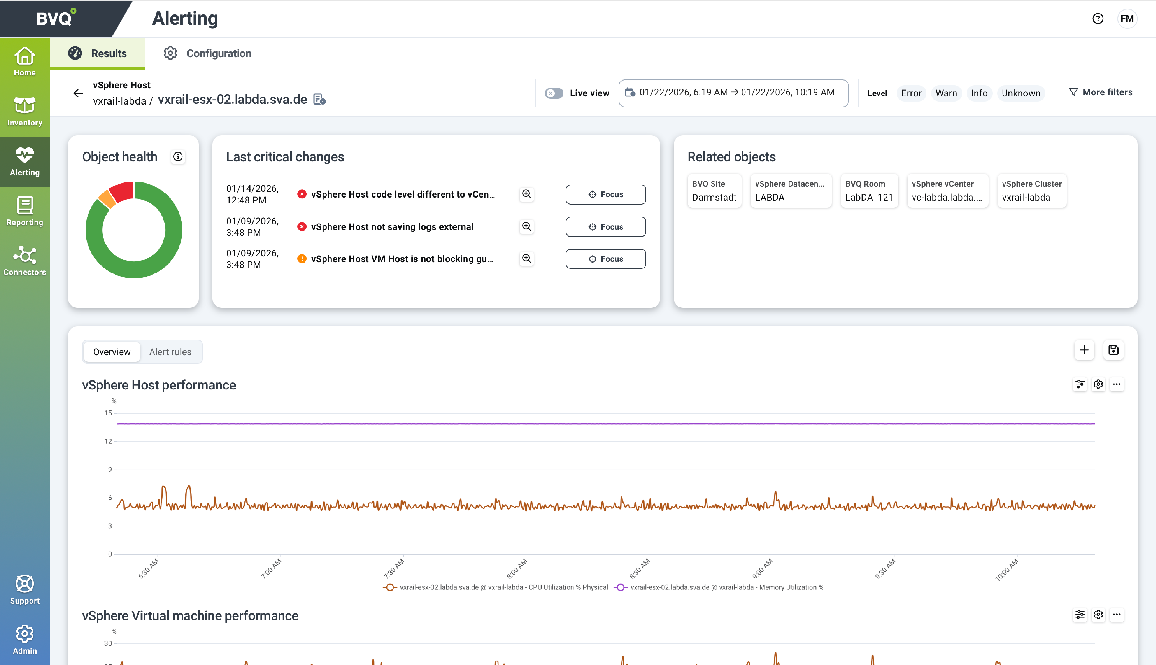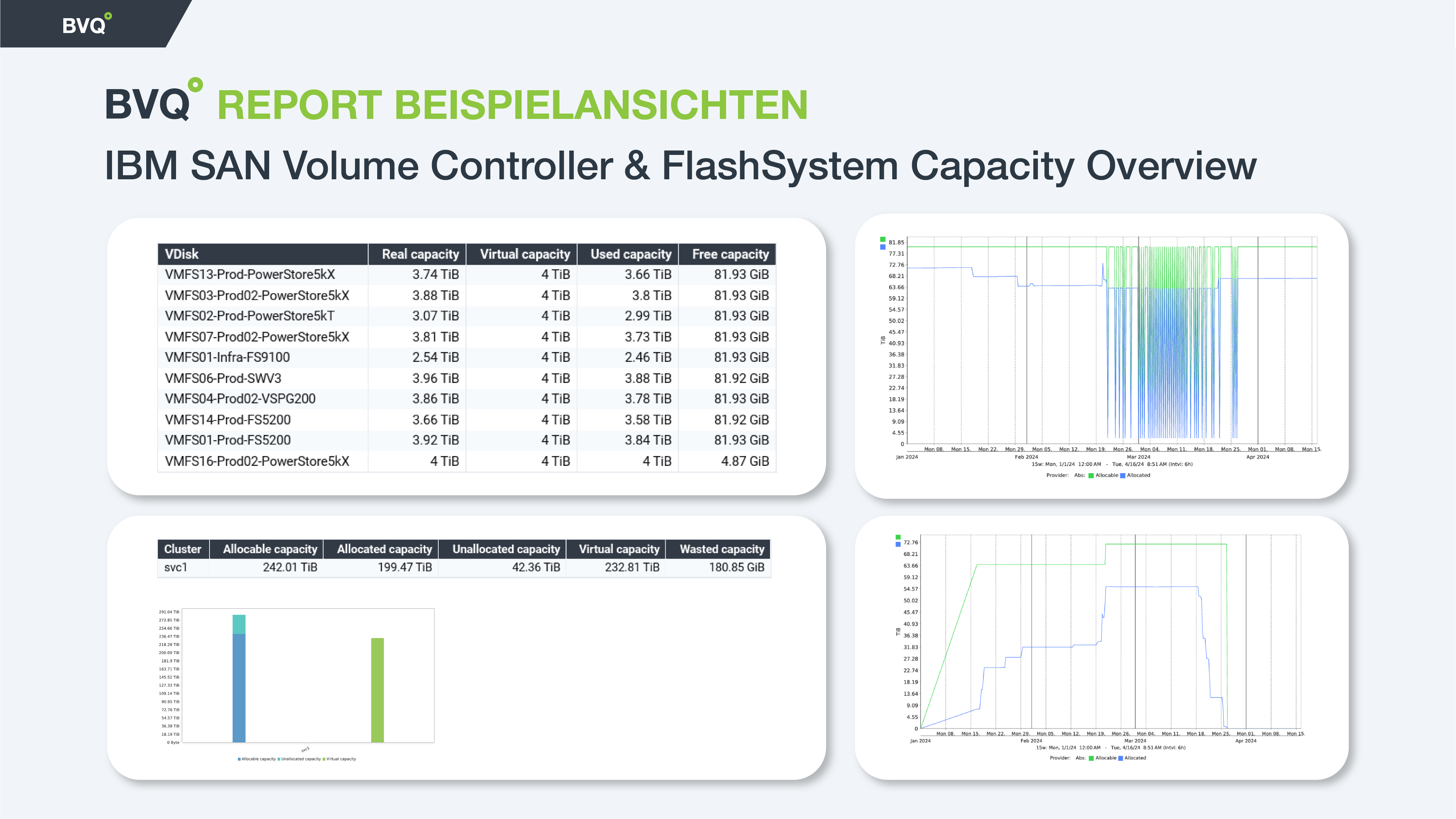 Durch die intelligente Analyse aktueller und historischer Betriebsdaten erkennt BVQ° Muster, die auf drohende Ausfälle oder Ressourcenverschwendung hinweisen – etwa durch überlastete Systeme, falsch konfigurierte Komponenten oder ungenutzte virtuelle Maschinen. Die integrierten Dashboards und Reports liefern nicht nur technische Kennzahlen, sondern übersetzen diese in klare, umsetzbare Empfehlungen. So lassen sich Betriebskosten senken, die Systemstabilität erhöhen und Compliance-Anforderungen zuverlässig erfüllen.