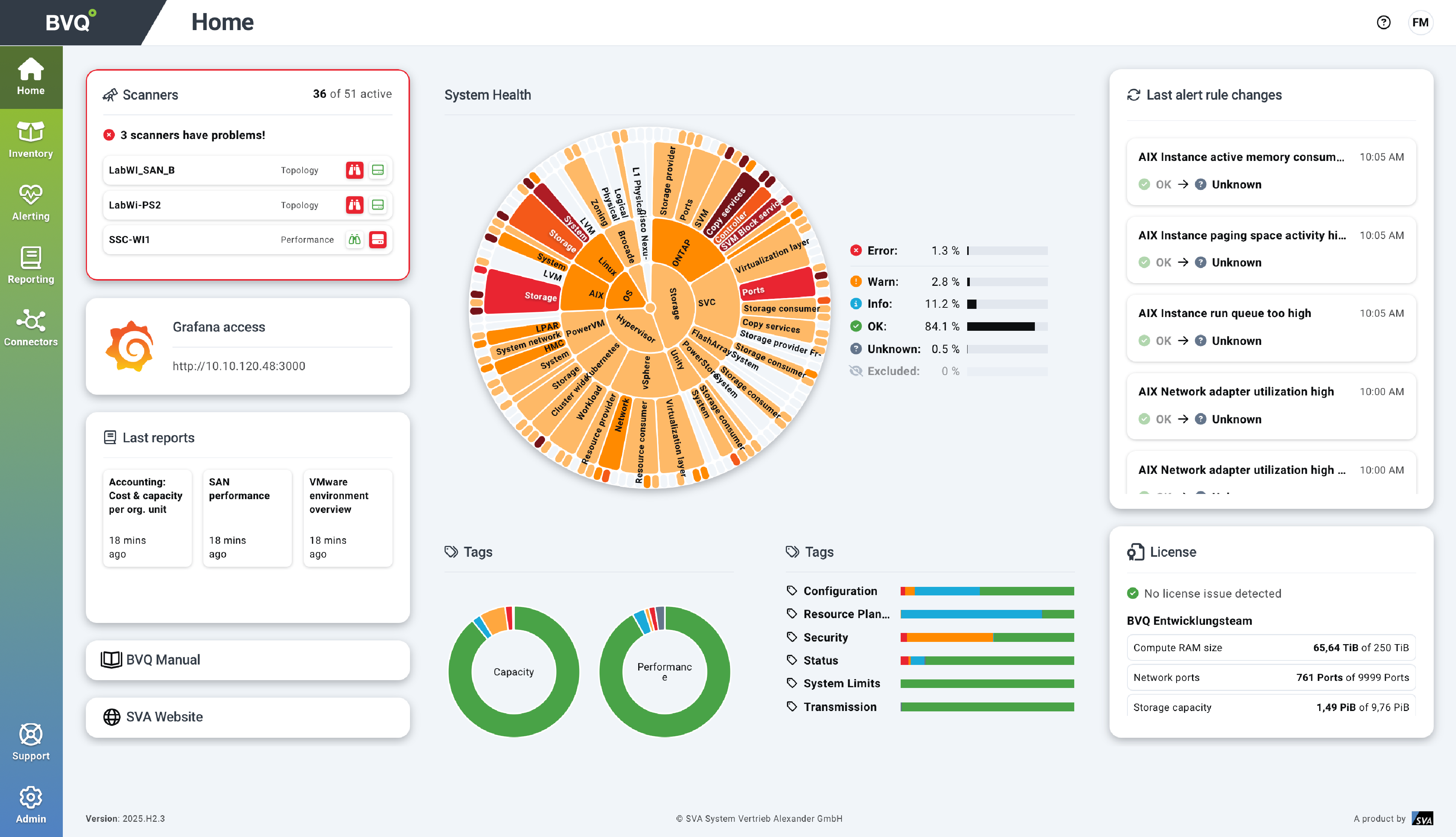 Durch die intelligente Analyse aktueller und historischer Betriebsdaten erkennt BVQ° Muster, die auf drohende Ausfälle oder Ressourcenverschwendung hinweisen – etwa durch überlastete Systeme, falsch konfigurierte Komponenten oder ungenutzte virtuelle Maschinen. Die integrierten Dashboards und Reports liefern nicht nur technische Kennzahlen, sondern übersetzen diese in klare, umsetzbare Empfehlungen. So lassen sich Betriebskosten senken, die Systemstabilität erhöhen und Compliance-Anforderungen zuverlässig erfüllen.